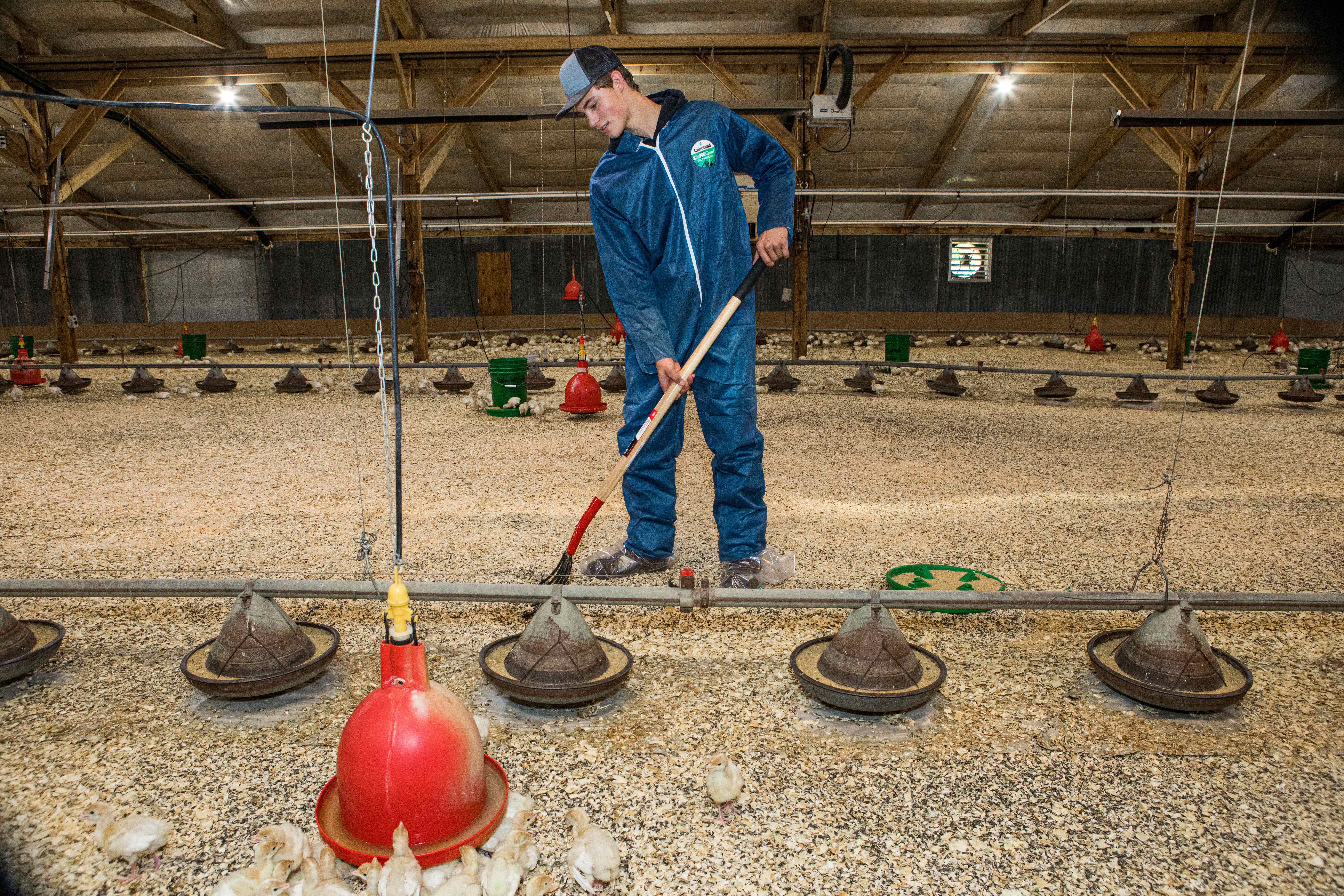 Litter conditions should be monitored daily as birds grow and manure output increases. Caked or compacted areas are hard to dry and increase ammonia release. Raking or tilling with a small tiller